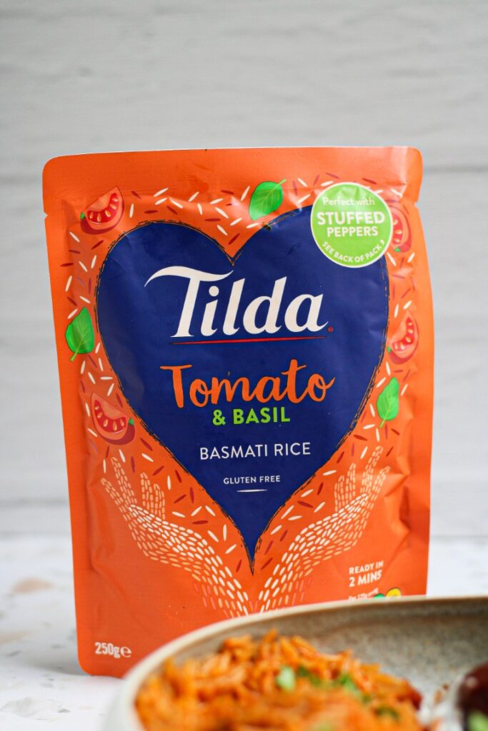 Ik koos bij dit gerecht voor voor de Tilda Tomato & Basil voorgestoomde rijst. Dat zit in een handig zakje die al voorgekookt is en op smaak is gebracht met sappige tomaten en geurige basilicum. Kant-en-klare mediterrane rijst dat in 2 minuten klaar is om te serveren.