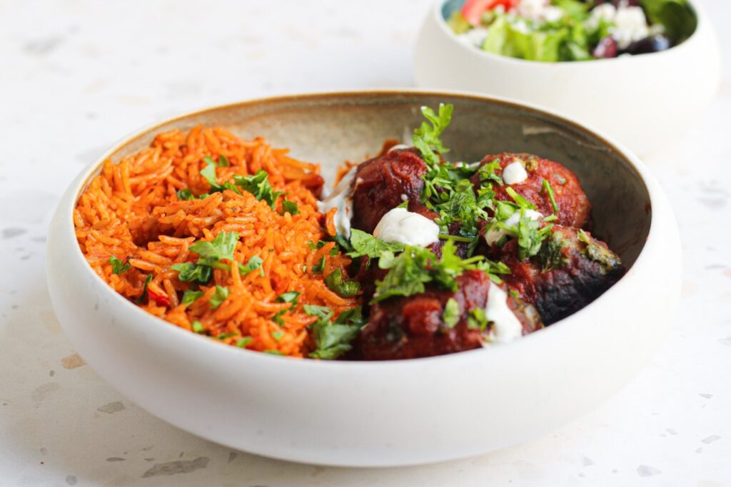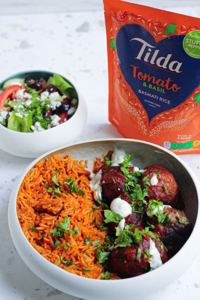 Ben je op zoek naar échte Griekse comfortfood? Dan moet je mijn Griekse soutzoukakia met keftedes (gehaktballetjes) in kruidige tomatensaus absoluut proberen. Ik serveer ze met de Tilda Tomato & Basil voorgestoomde rijst, die dankzij zijn mediterrane smaak van sappige tomaten en basilicum een perfecte match vormt. Om het gerecht helemaal af te maken, voeg ik een lepel romige tzatziki toe en een frisse Griekse salade met sla, komkommer, tomaat, olijven en feta. Zo breng je in een handomdraai de Griekse zon op je bord. Καλή όρεξη (Kali Orexi) oftewel: eet smakelijk! 🙂