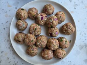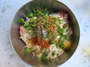 - Meng alle ingrediënten voor de gehaktballetjes in een grote kom en kneed stevig (5-10 minuten) zodat de smaken goed mengen. Laat 1 uur rusten in de koelkast.
