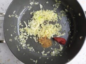 - Fruit de ui en knoflook in olijfolie tot ze glazig zijn. Voeg de tomatenpuree en komijn toe en bak kort mee.