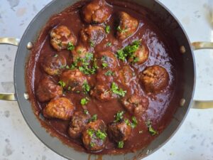 - Leg de gebakken gehaktballetjes in de saus en laat 30 minuten zachtjes pruttelen zodat de smaken goed intrekken.