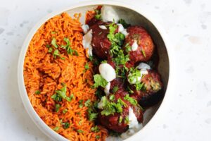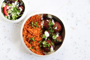 Ben je op zoek naar échte Griekse comfortfood? Dan moet je mijn Griekse soutzoukakia met keftedes (gehaktballetjes) in kruidige tomatensaus absoluut proberen. Ik serveer ze met de Tilda Tomato & Basil voorgestoomde rijst, die dankzij zijn mediterrane smaak van sappige tomaten en basilicum een perfecte match vormt. Om het gerecht helemaal af te maken, voeg ik een lepel romige tzatziki toe en een frisse Griekse salade met sla, komkommer, tomaat, olijven en feta. Zo breng je in een handomdraai de Griekse zon op je bord. Καλή όρεξη (Kali Orexi) oftewel: eet smakelijk! 🙂