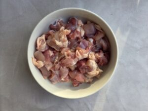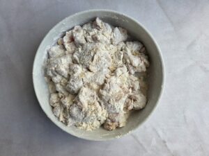 - Meng de kipstukjes met ½ theelepel baking soda en meng het door elkaar. Laat 15 minuten staan.