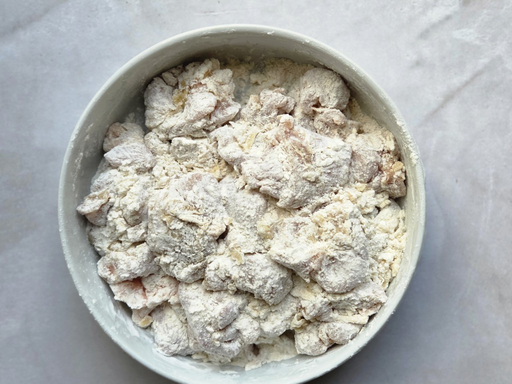 - Haal elk kipstukje erdoor en zorg dat elk stuk dik en poederig is.