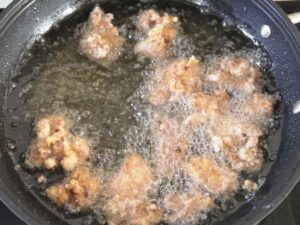 Zorg voor een hoge wok met voldoende olie in. Net genoeg om de kip half te bedekken zodat ze mooi kan “drijven”.