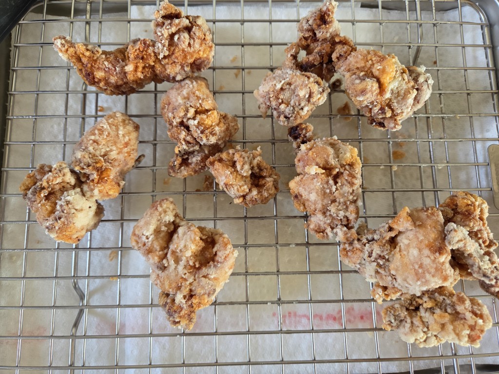 - Haal de kipstukjes eruit en laat even uitlekken en rusten op een rooster of keukenpapier. Laat 5-10 minuten rusten.