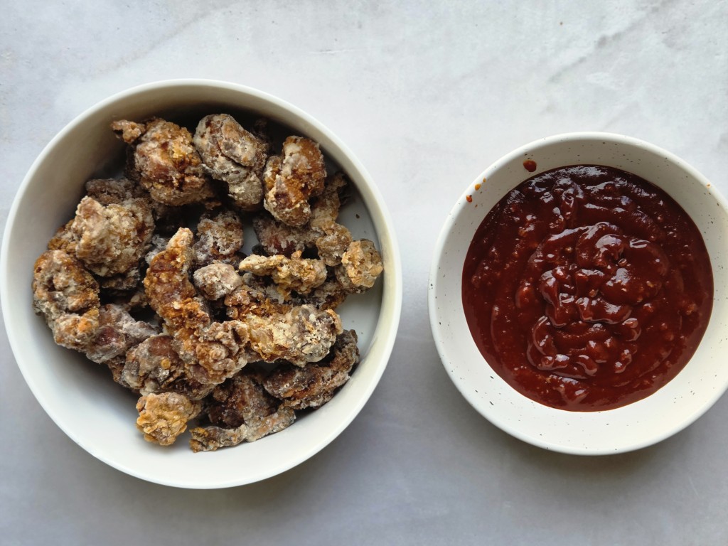 Samen krijg je dus krokante kip met een zoet-pikante saus.