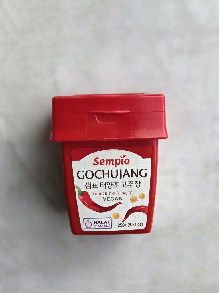 Ter info: Gochujang is een traditionele Koreaanse gefermenteerde chilipasta. Ze is dieprood van kleur, pittig maar tegelijk licht zoet en hartig. Gochujang wordt vaak gebruikt in de Koreaanse keuken en vormt de basis van bekende gerechten zoals yangnyeom kip, bibimbap, tteokbokki, bibimbap en verschillende marinades en sauzen.