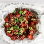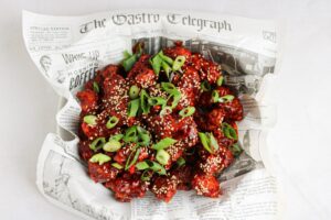 Na het frituren wordt de hete kip meteen door de warme saus gehaald, zodat elke centimeter perfect bedekt is. Afwerken doe je met sesamzaadjes en lente-uitjes.