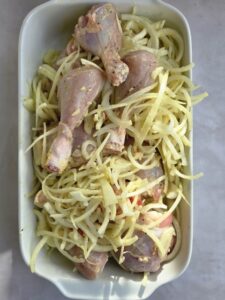 • Haal de kip uit de marinade en laat de uien zoveel mogelijk achter in de schaal. (die worden apart gebakken)