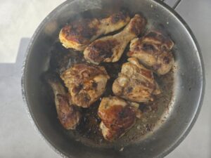 • Verhit de olie in een grote pan op middelhoog tot hoog vuur. Bak of grill de kip rondom goudbruin met licht gekarameliseerde randjes. De kip hoeft nog niet volledig gaar te zijn. Behou zoveel mogelijk vloeistof in de pan. Zet apart.