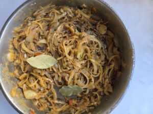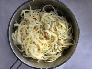 • Voeg de gemarineerde uien toe aan dezelfde pan, samen met een scheut van de marinade en de laurierblaadjes.