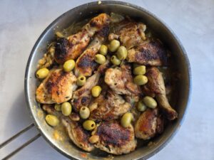 • Leg de kip terug in de pan bij de uien. Voeg de rest van de marinade en 250-400 ml kippenbouillon toe (net genoeg om sappig te stoven)